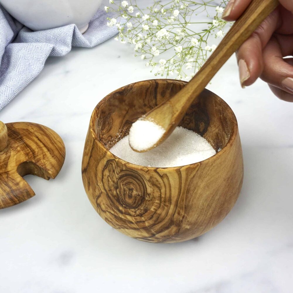 Die Zuckerdose verfügt über einen abnehmbaren Deckel aus nachhaltigem Olivenholz, der den Inhalt vor Staub und Feuchtigkeit schützt. Passend zur praktischen Dose bieten wir auch eine Gewürzschaufel in passender Größe an. So können Sie Ihrer Küche ein komplett neues Ambiente verleihen.