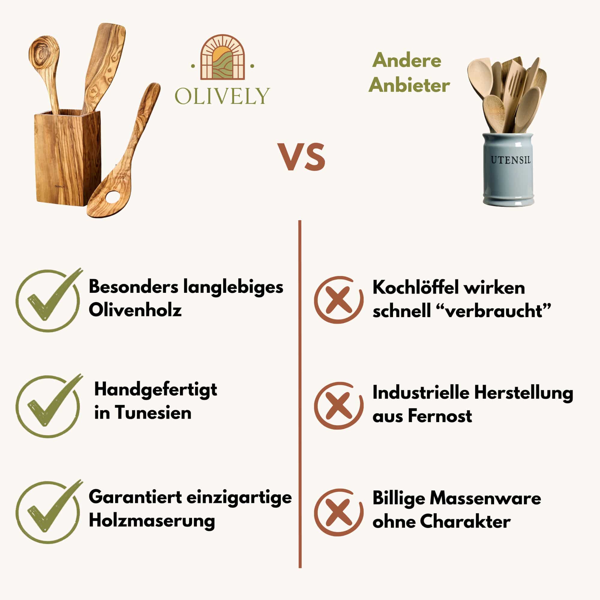Unsere Kochlöffel werden nicht nur mit Sorgfalt von Hand gefertigt, sondern bestehen auch aus nachhaltig gewonnenem Olivenholz. Das bedeutet, dass ausschließlich Holz von Bäumen verwendet wird, die keine Früchte mehr tragen. So kombinierst du beim Kochen Qualität mit Umweltbewusstsein – und jeder Löffel ist ein echtes Unikat, da die wunderschöne Maserung immer individuell bleibt.