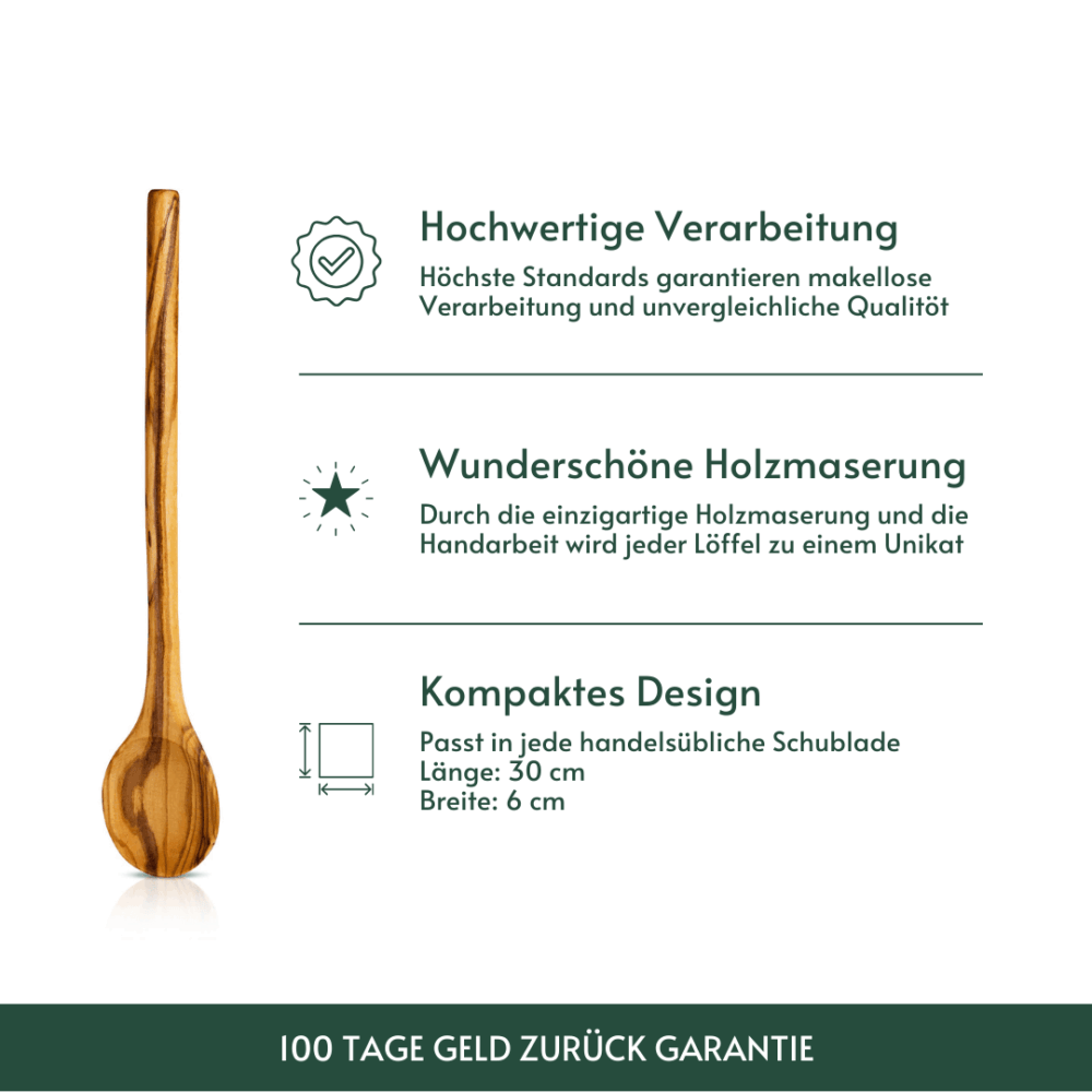 Unsere Kochlöffel werden nicht nur mit Sorgfalt von Hand gefertigt, sondern bestehen auch aus nachhaltig gewonnenem Olivenholz. Das bedeutet, dass ausschließlich Holz von Bäumen verwendet wird, die keine Früchte mehr tragen. So kombinierst du beim Kochen Qualität mit Umweltbewusstsein – und jeder Löffel ist ein echtes Unikat, da die wunderschöne Maserung immer individuell bleibt.