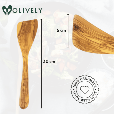 Jeder Pfannenwender wird aus einem Stück Olivenholz handgefertigt. Das bedeutet: Einzigartige Maserung, individuelle Form – kein Exemplar gleicht dem anderen! Zudem liegt das ergonomische Design angenehm in der Hand und macht das Wenden, Rühren und Servieren mühelos.