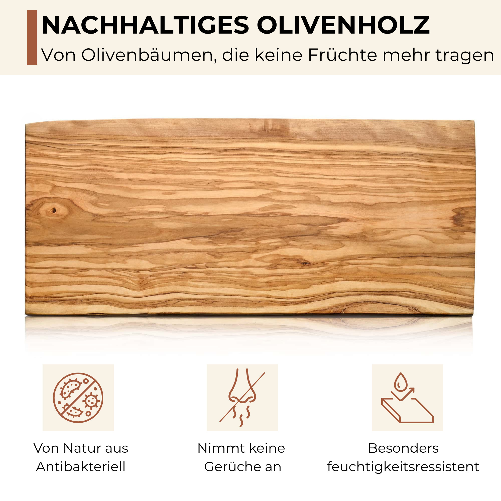 Wissenschaftlich bewiesen ist die antibakterielle Wirkung von Holz. Das Olivenholz sticht dabei besonders heraus. Auf ihm haben Bakterien die geringsten Chancen, sich zu vermehren. Die Gerbsäure im Holz hilft dabei, die Ausbreitung zu mindern. Bakterien, die beim Kochen auf das Holz gelangen, werden also abgetötet. Dieser Effekt ist zugleich der porösen Holzstruktur zu verdanken, die Wasser in tiefere Holzschichten durchlässt und Bakterien zugleich das zur Vermehrung benötigte Wasser entzieht.