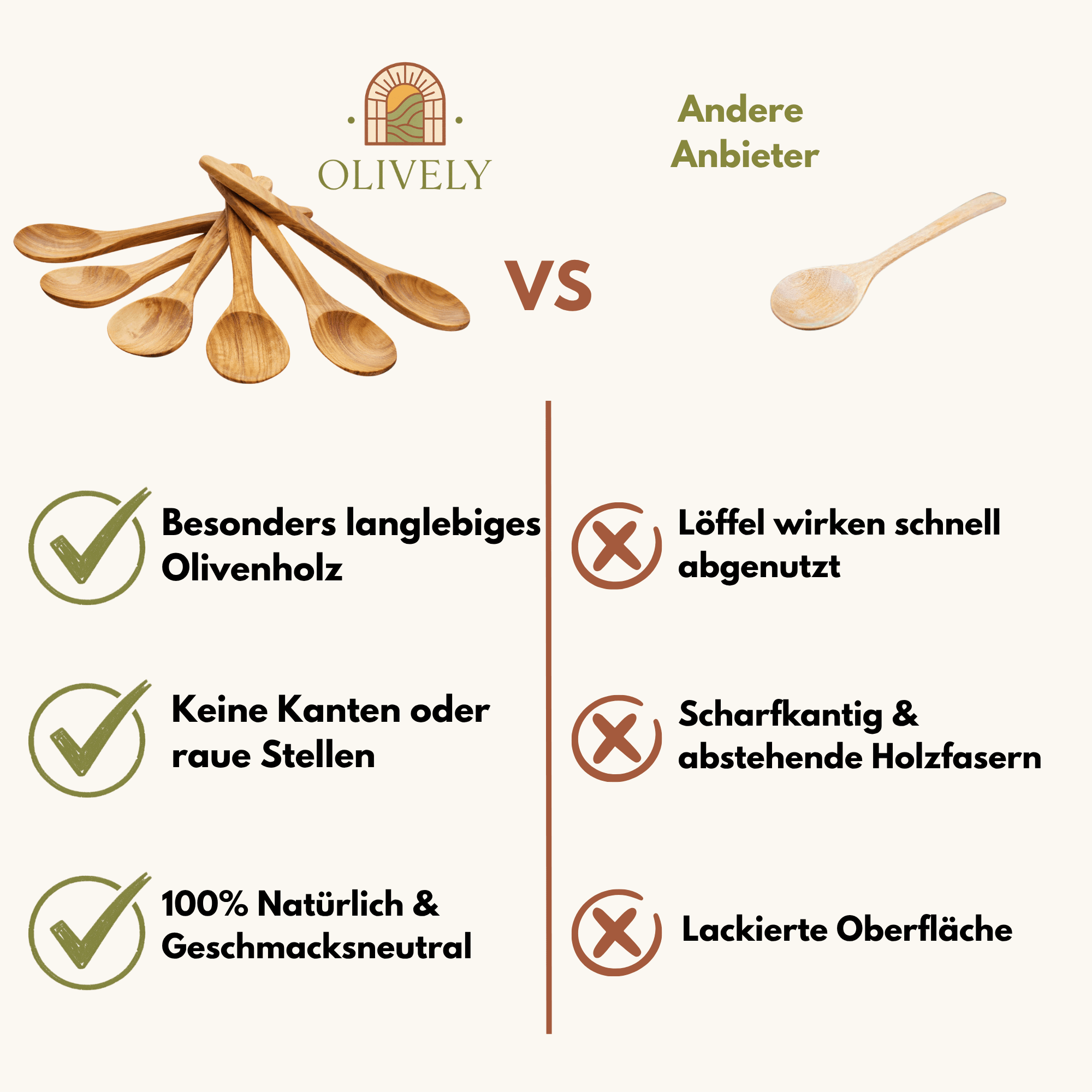 Hochwertiges Olivenholz: Unser Olivenholz ist nicht nur wunderschön, sondern auch besonders robust und widerstandsfähig. Die Löffel werden aus robustem und langlebigem Olivenholz gefertigt, das für seine natürliche Schönheit und Widerstandsfähigkeit bekannt ist. Jedes Stück ist ein Unikat mit individueller Maserung.